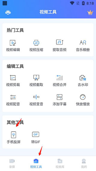 1、打开视频工具,在其他工具中可以找到手机投屏,点击进入;