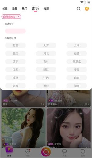 4、在附近栏中,用户可以切换所在地,浏览全国各地的主播。