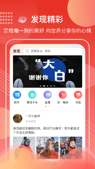 第一视频一款功能全面的实用型综合服务社交平台,致力于为用户打造别具一格的社交体验。其功能涵盖多个维度,用户不仅能够在平台上分享生活中的精彩瞬间,还能观看卫视直播,领略中华大地的风土人情,更可借助树洞功能倾诉心声、释放情绪。感兴趣的朋友,欢迎下载一试~