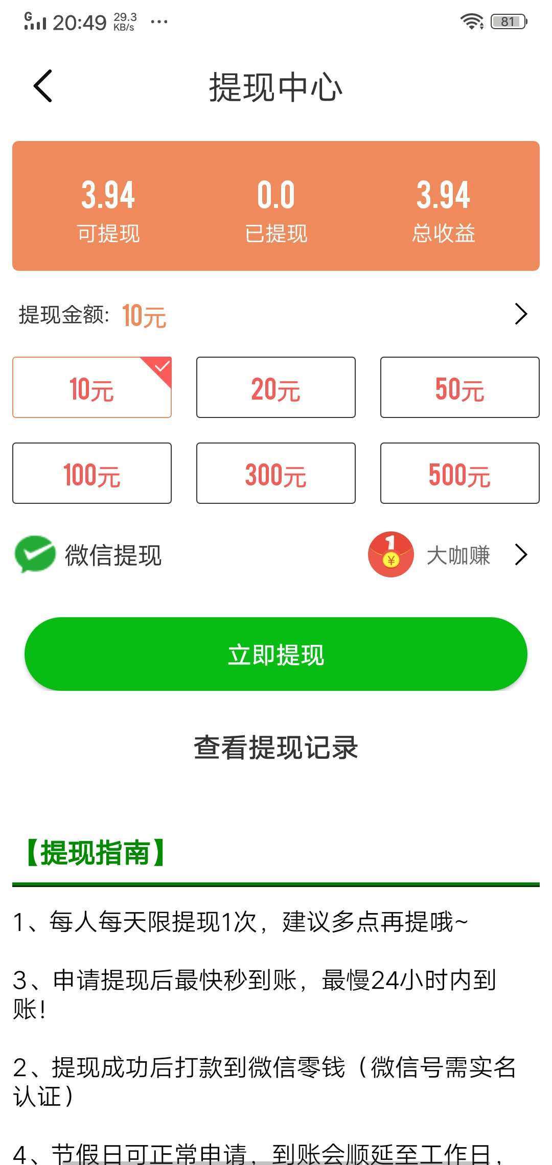 首提余额满5元即可,后续再次提款需要10元起,每天限提一次,90%以上的用户提款为秒到账,其余的下午三点前提款当天到账,三点后次日到账。