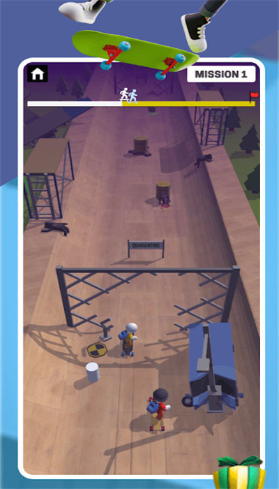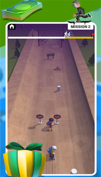 1、翻转滑板长板冲刺通过手指滑动控制滑板,转弯、加快、跳动,通过各种障碍物和跳动点;