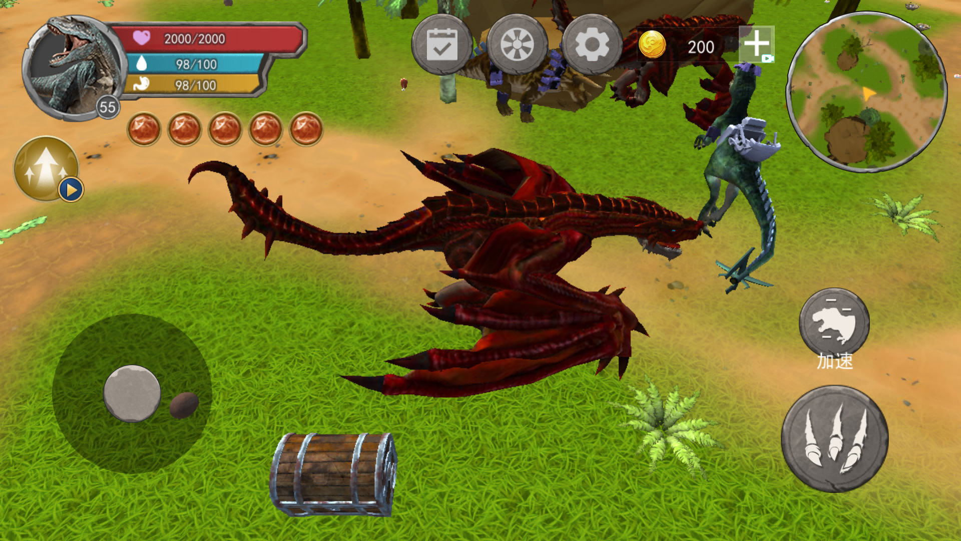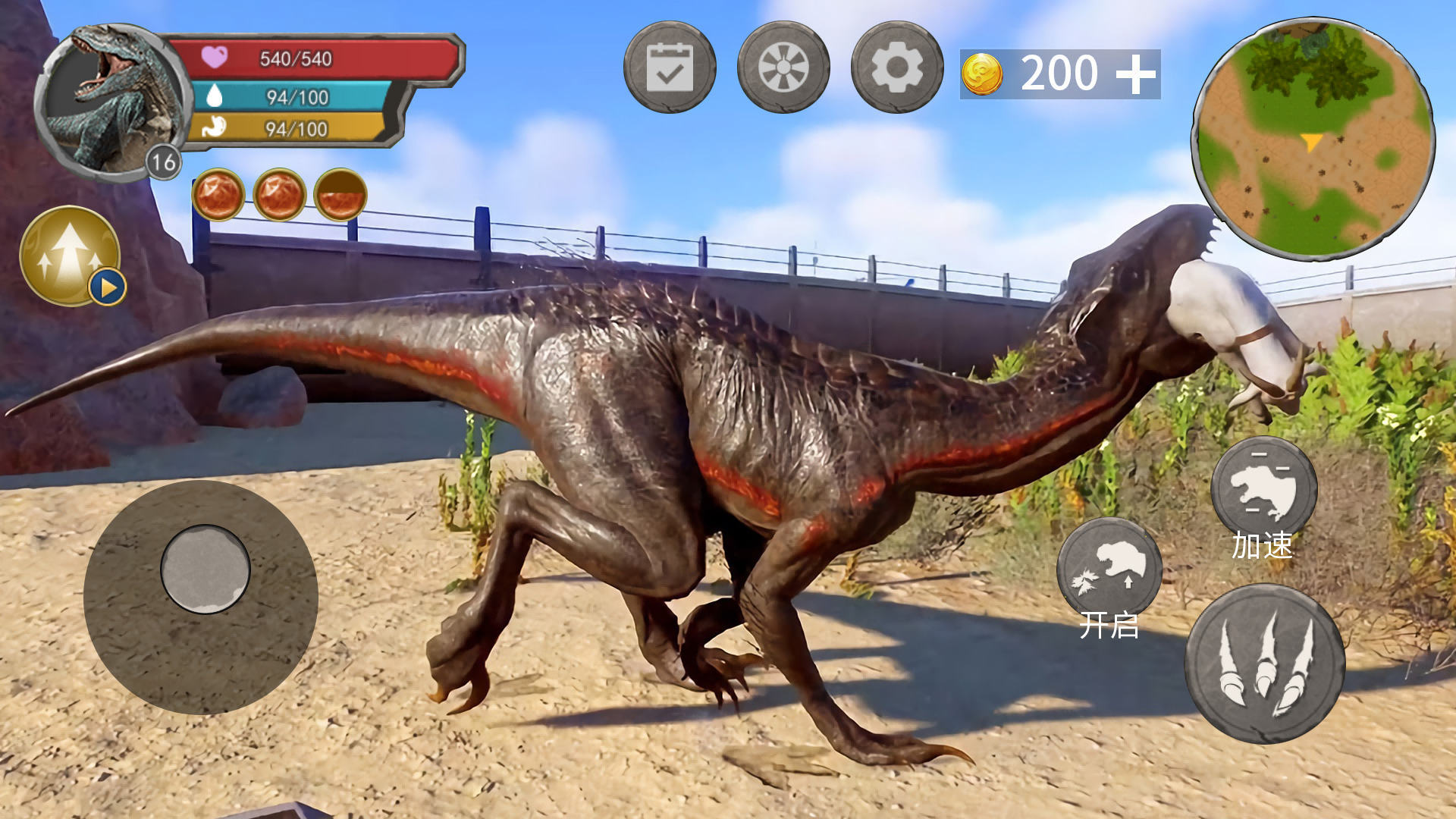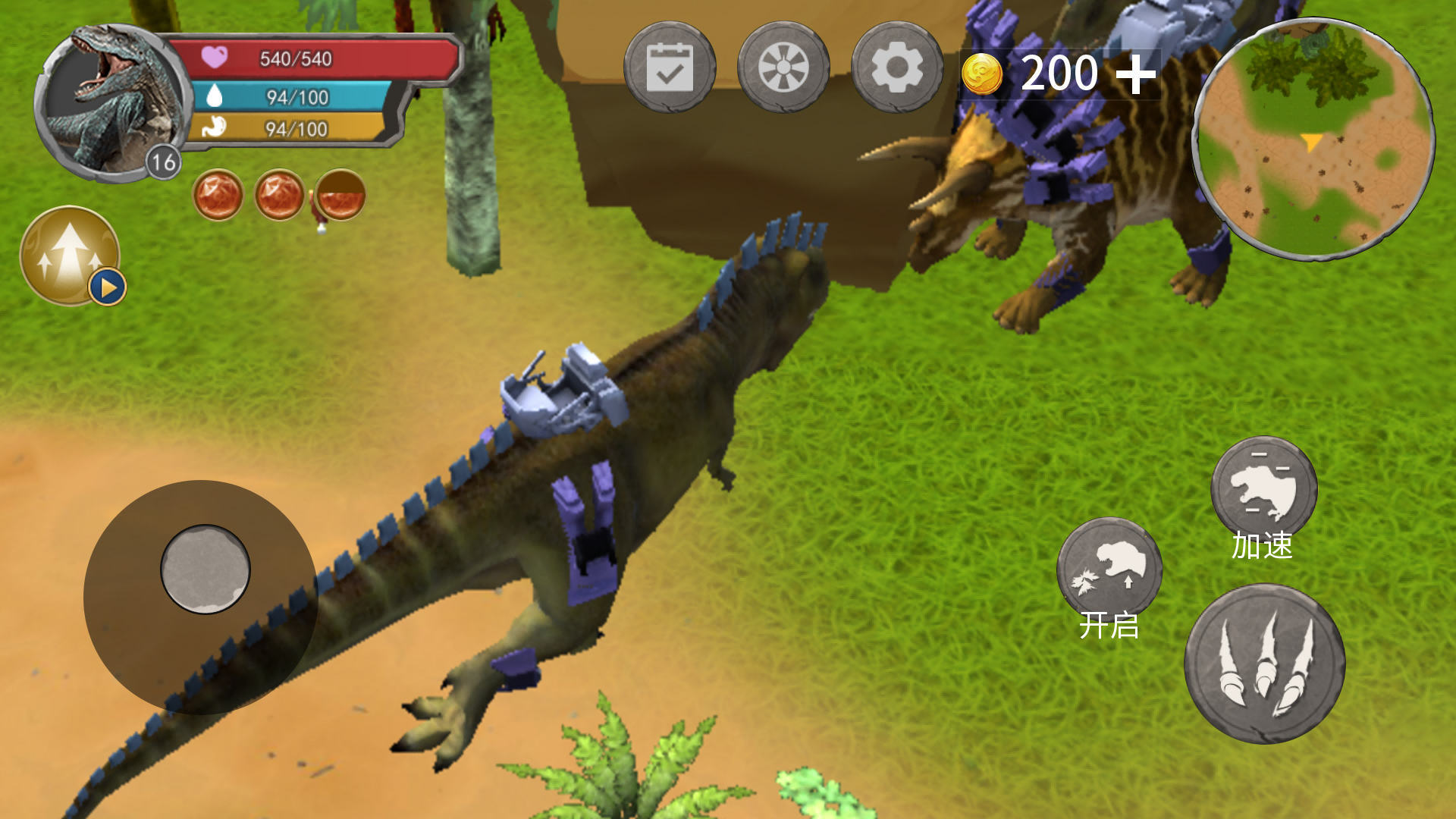 2、通过操作恐龙采集各种资源,并为他购买新的装备,升级技能,提高实力;
