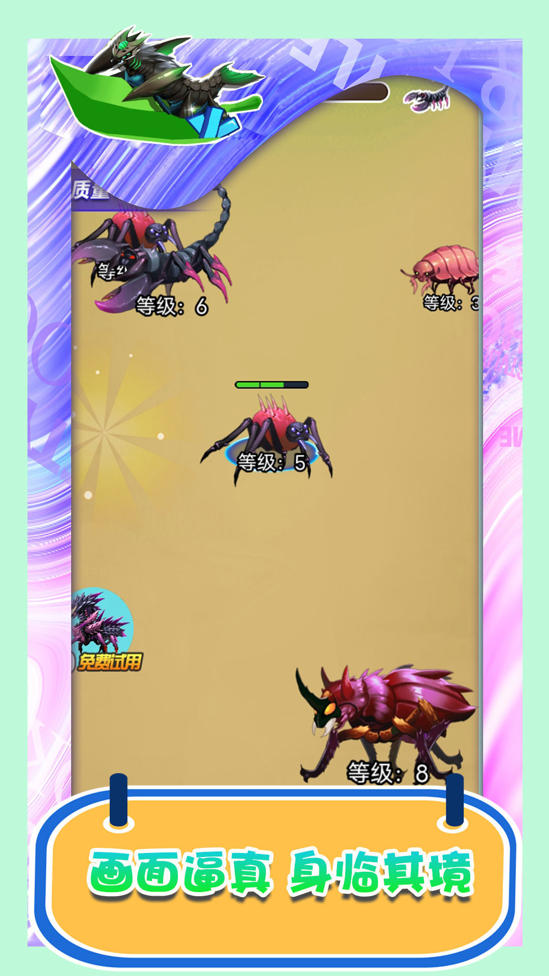 1、昆虫史诗般的冒险中收集和培育自己的宠物,不断提升它们的等级和能力;