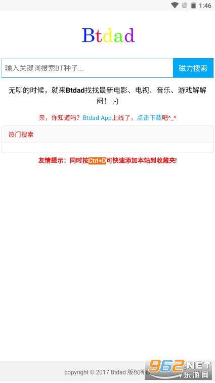 《btdad最新官方版》是一款极为好用的磁力搜索工具。在此工具中,拥有各类丰富的数据资源,像游戏、视频、小说、动漫、戏曲、新闻等等。你仅需以关键字的形式,将想要查找搜索的内容输入其中,它便会为你提供最为优质的直链帮助。欢迎有此需求的朋友前来下载体验。