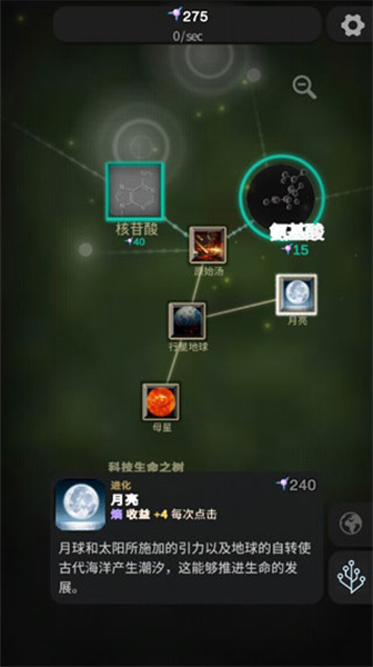从细胞到奇点是一款独具创意的科学放置模拟游戏。游戏回溯至45亿年前无生命的太阳系,玩家通过点击,见证地球原生浆液中生命的萌芽。每点一次,获取 “熵”,解锁生命演化里程碑,像恐龙灭绝、工业革命等,还能畅想未来演化,在3d栖息地看生命进化成果 。