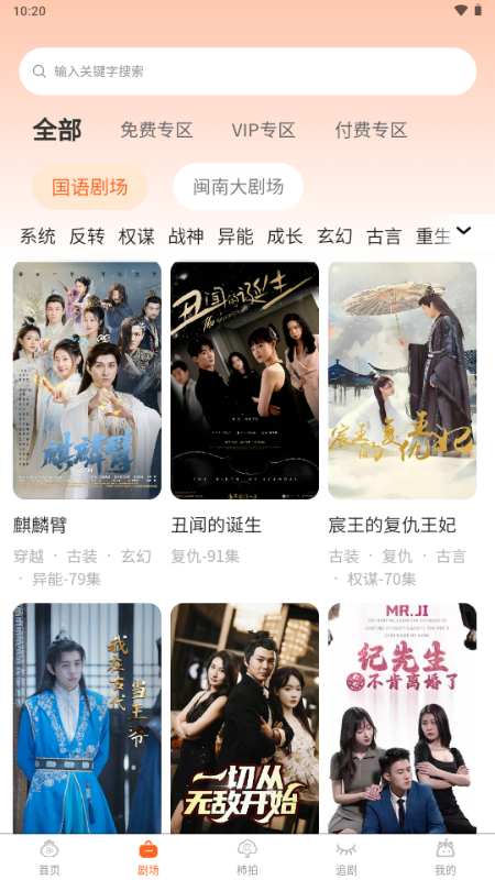 柿播短剧是一个专注于短剧播放的手机应用程序。汇聚众多优秀创作者的高质量原创作品,涵盖悬疑、爱情、喜剧、科幻等诸多风格。设有国语剧场、闽南大剧场等专门板块,还划分了免费、VIP、付费专区,用户能依据自身需求随心挑选。界面简洁直观,配色鲜艳,内容分类清晰,操作按钮直观,热门推荐、最新上线内容或专属推荐榜单一目了然,可帮助用户快速定位心仪短剧,契合手机使用习惯,上手容易。