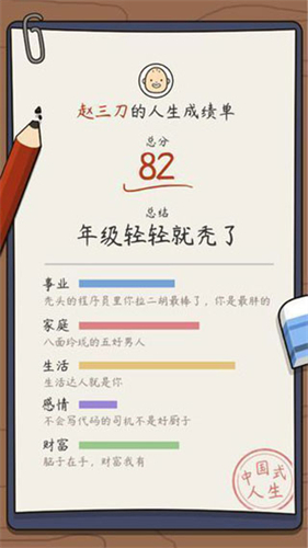 中国式人生是一款模拟文字游戏。游戏中,玩家从出生开始,经历成长、学习、工作、恋爱等人生阶段,可自由选择职业、伴侣等,体验丰富随机事件,感受中国式成长经历, 不同的选择有不同的结局,快来玩吧。