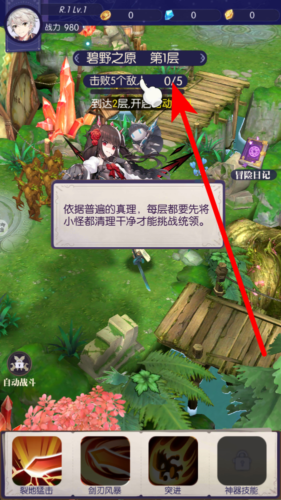 1、进入游戏迷宫层,查看界面上方任务要求,如碧野之原第1层需击败5个敌人,依据提示清理对应数量小怪,为挑战统领做准备。
