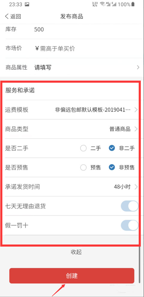 6、向下拉动页面至【效劳许诺】处,按照自身需求填写页面中的项目,然后点击【建立】,便可发布商品。