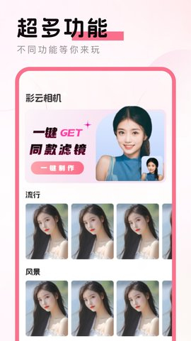 彩云相机是一款好用又强大的手机美颜相机软件,深受广大青年们的喜欢,软件包含了多种艺术风格的照片模板,帮助大家轻松的拍出各种精美高级的照片,还拥有强大的后期修图功能,让你一键生成最美照片,喜欢拍照的用户们千万别错过了。