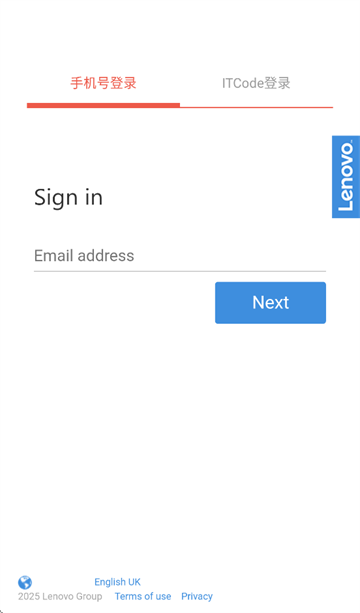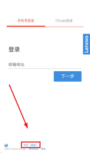 打开联想智店通,进入登录界面后,点击下方中文 (简体)