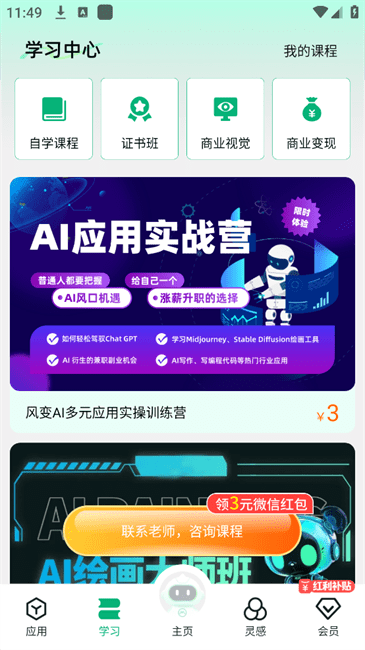 2.在【学习】在可以获取各种关于ai技能的学习以及培训