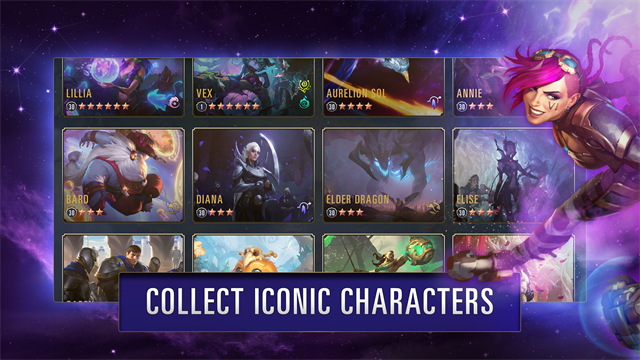 扮演金克丝、沃里克、凯特琳、薇、安贝莎,或任何一位不断壮大的英雄阵容(超过65位)。在符文之地的地图上,你可以收集、进化和精通众多英雄。