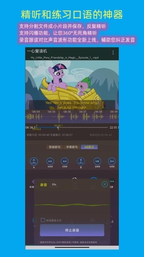 一心复读机是一款手机复读机软件,软件拥有智能断句,字幕解析,录音跟读,收藏等等功能,可以帮助用户更好的复读学习。