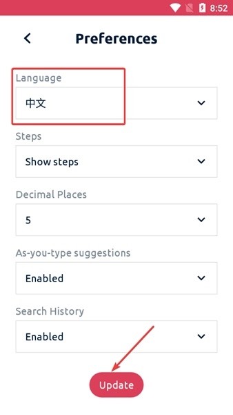 3、将language设置成中文,最后点击下方的update即可。
