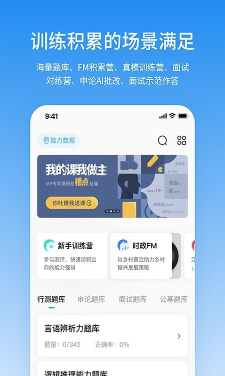 网罗海量整卷、免费在线模考、视频解析课;FM晨读音频和文稿,轻松积累热点;面试对练答题点评一体,准确把握面试思维。