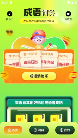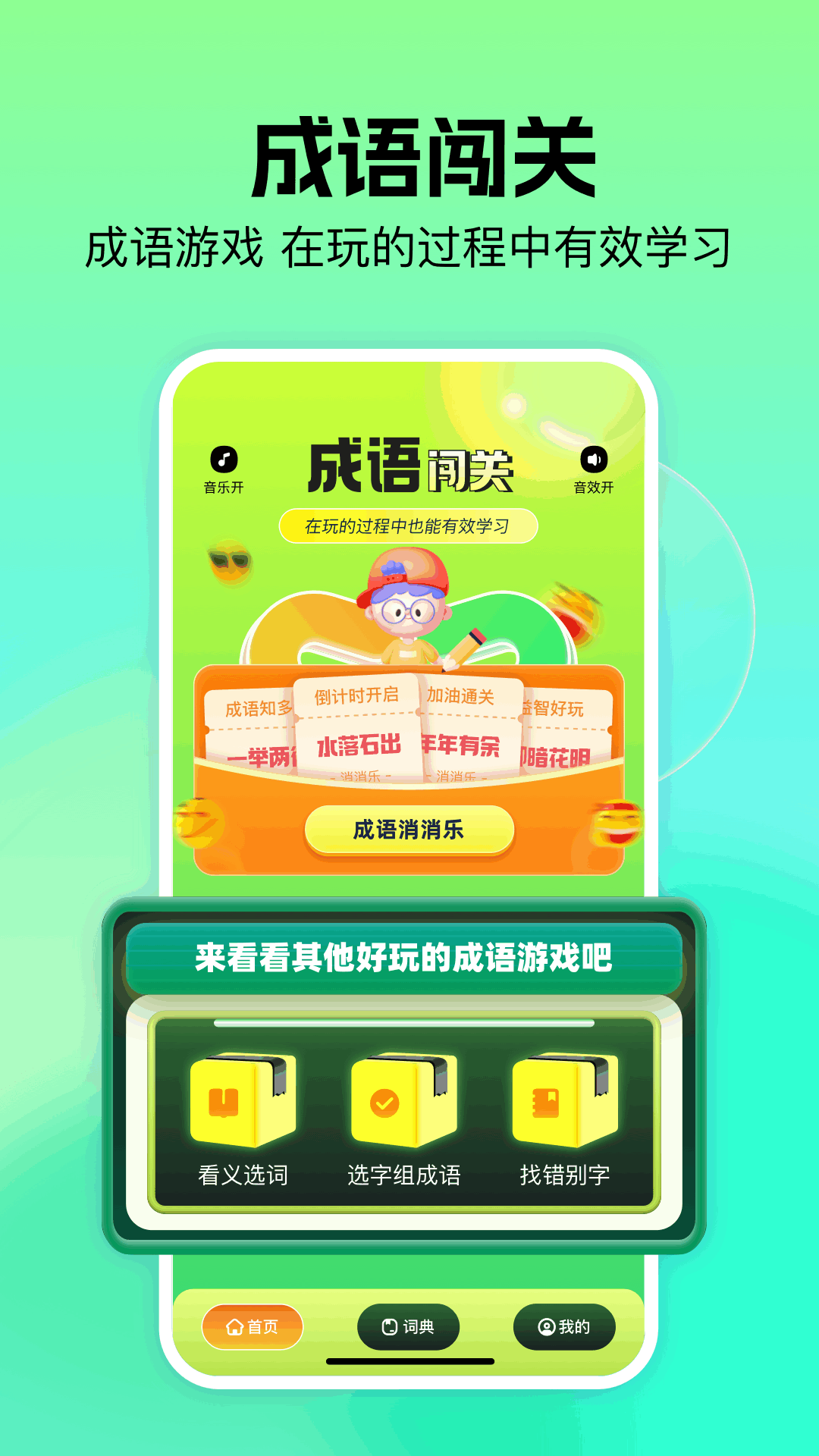 2、成语消消乐、成语闯关等丰富多样的游戏,以及看义选词、选字组成语、找错别字这类细分的游戏类型,让成语学习趣味盎然。