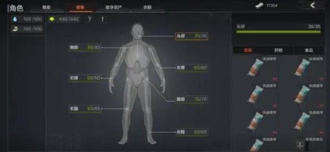 新手常面临的伤口和损伤三种状态,分别对应医疗包、绷带和手术包。一般可以先在安全处用绷带止血,再使用手术包治疗损伤,最后用医疗包恢复满健康值。