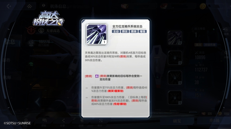 在当前情况下,【天帝高达】无疑是最优之选。其主动技能能够对敌方全体目标发起攻击,同时让他们进入燃烧状态,出色地解决了“燃烧”效果的覆盖率难题。指挥官们可借助参与【冲突战区】玩法,赢取“战区币”来兑换【天帝高达】,进而迅速优化队伍的配置组合。