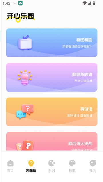 2399玩游盒是一款人气颇高的免费游戏盒子,平台会为你推荐各类热门优质游戏,最新的攻略技巧也会每日更新。特色的趣味猜栏目涵盖看图猜剧、脑筋急转弯、猜谜语、歇后语大全等多种小游戏,等待你前来参与;还有创意画板项目,你可以自由调配颜色为线稿模板填色,或是发挥想象进行原创绘画。感兴趣的小伙伴,快来2399玩游盒体验一番吧。