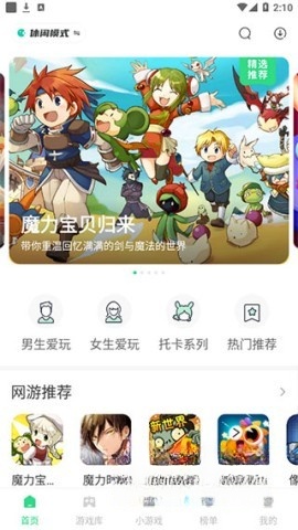 2、在首页上方找到“推荐模式”,点击后切换至休闲游戏专区,在此能找到男生、女生、托卡系列等热门推荐内容。