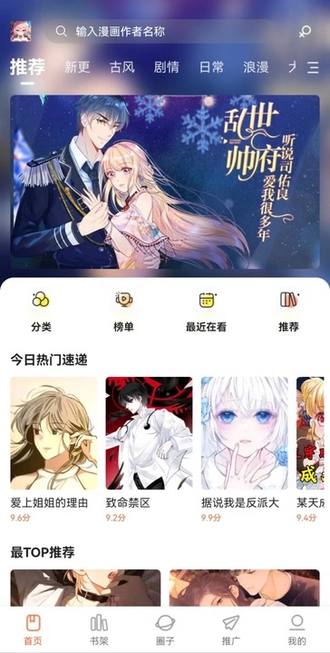 2. 在主页面即可看到各类漫画和实用功能,可以按需使用。