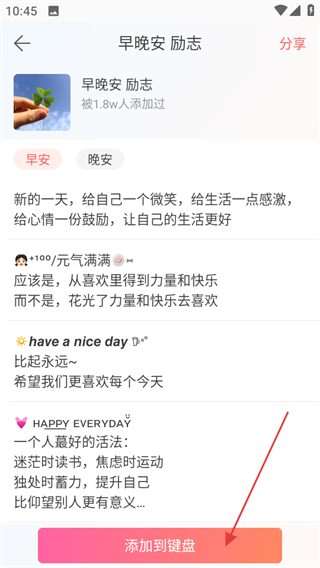 3、在分类文案页面,若想使用某条文案,点击添加到键盘,可将文案添加到键盘方便使用。