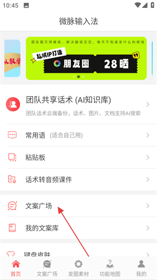 1、进入微脉输入法首页,点击文案广场,进入文案广场页面。