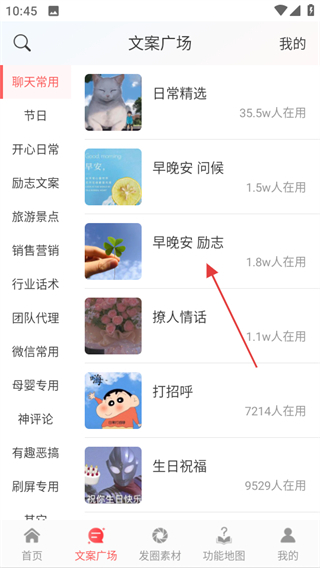 2、在文案广场页面,选择想要的文案分类,如早晚安励志,进入该分类文案页面。