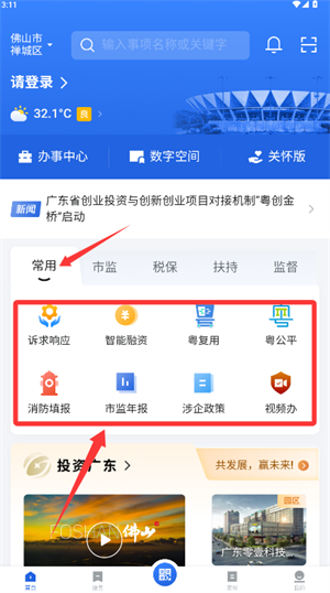 3、在首页,在常用服务栏按需选择诉求响应或智能融资等功能。