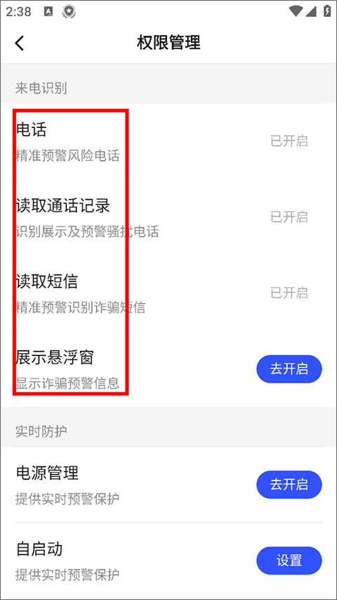2、进入权限管理页面,用户需要开启电话、短信、通话记录、悬浮窗等权限。
