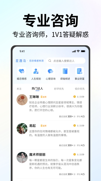 星趣岛是一款面向国内用户的情感心理咨询疗愈类软件。它的核心特色在于把AI技术与塔罗牌、情感咨询、心理疗愈等元素融合在一起。平台上汇聚了大量专业人士与文化爱好者,涵盖心理、星座、情感、身心灵、职场教练、婚恋等多个领域。这些从业者能够精准捕捉用户的心理状态,通过交流帮助用户缓解或解决心理困扰,疏导负面情绪,从而让用户更好地认识自我,以更积极自信的姿态面对生活。