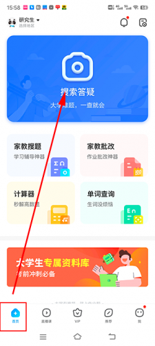 1、打开软件,直接进入首页,点击拍照按钮,选择拍照搜题。