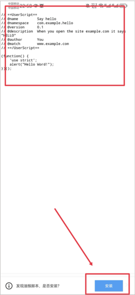 7、进入后会显示脚本代码,你可以选择复制代码进行添加安装,也可以直接点击下方弹出的“安装”按钮完成操作。