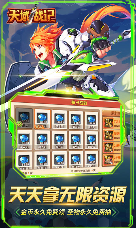 《天域战记》是一款精心打造的超变态福利Q版ARPG手游大作!(无线充值卡每日福利领取至尊抽奖卷和金币,转职福利领取千元充值卡)上线送满V、传说级死灵战车坐骑,永久每日送至尊抽奖券、无限金币,永久每日送充值卡,无限福利领不停!