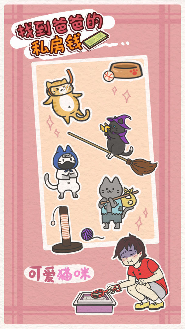 通过简单的操作,运用道具的帮助,地毯式扫荡家里的各个角落,找到爸爸的私房钱!