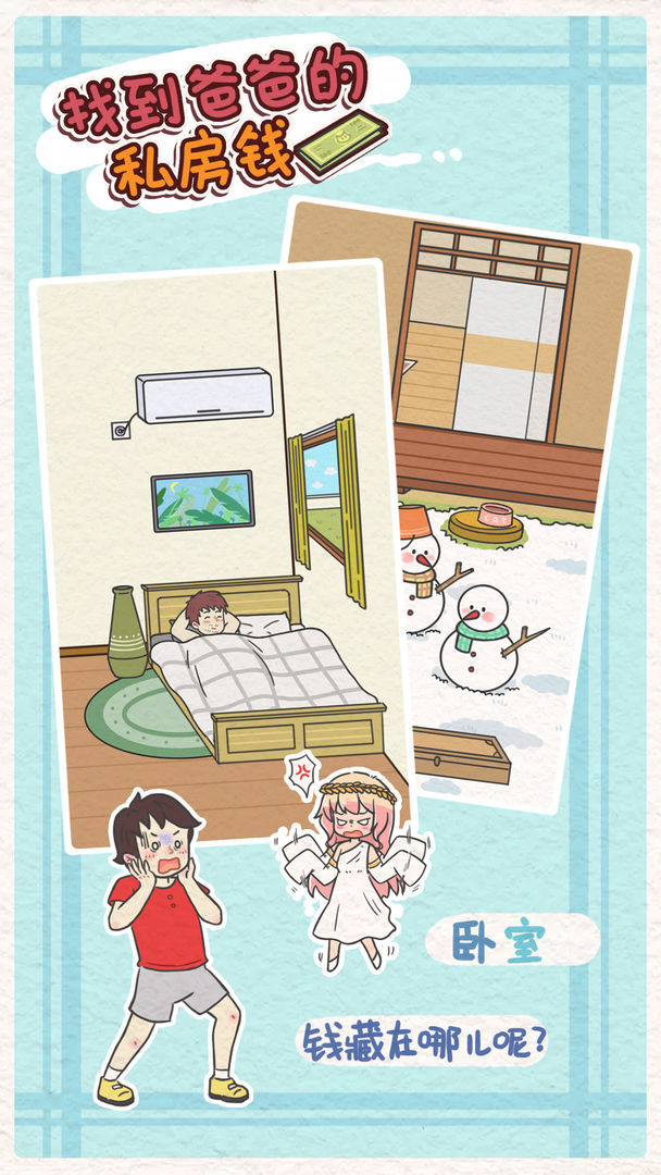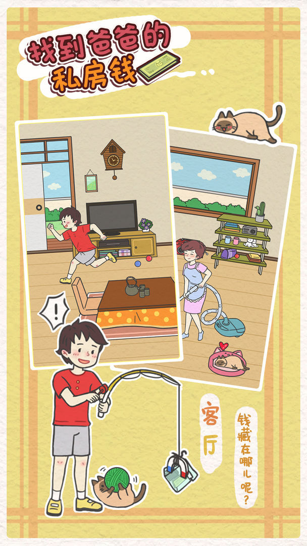《找到爸爸的私房钱》找到爸爸的私房钱》是一款寻物解谜游戏,爸爸竟然背着妈妈偷偷藏了私房钱,还告诉妈妈没有藏钱。所以,本不该存在的钱被我花掉也是理所当然的吧。就让我们一起找到爸爸的私房钱,看他发现钱没了的有趣表情吧。