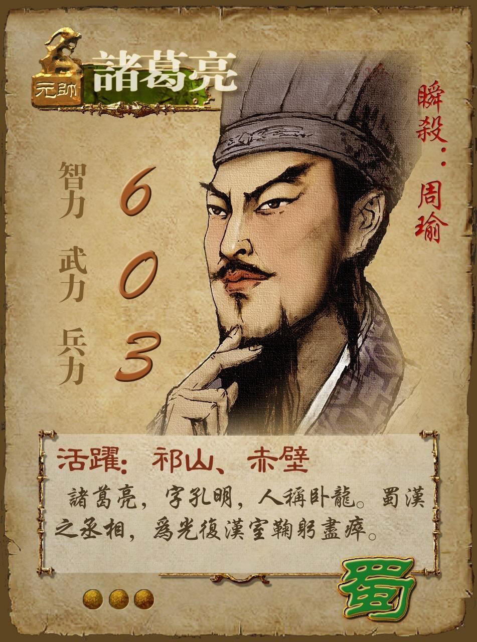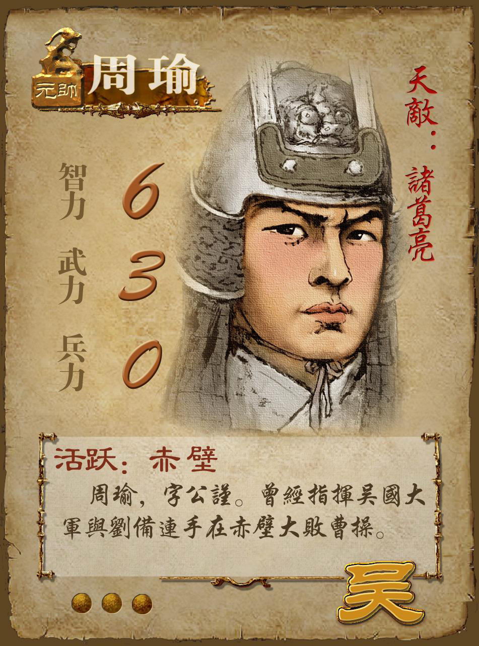 能力:为了体现武将不同方面的能力,所以具体又分为智力、武力、兵力三种能力。(在牌面上由上到下的顺序是智力、武力、兵力)