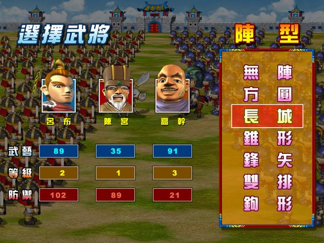 作战前要做的是“决定阵形”,游戏中的七种阵形,各有攻击力增强和消长的相生相克效果。武将需先察知对手善长什么阵形,然后设定具有反据效果的阵形。阵形共有“无阵”“方圆”“长蛇”“锥形”“锋矢”“双排”“钩形”七种。阵形依据其相生相克设定,要是选到能克对手的阵形,可说作战已经赢了一半了。