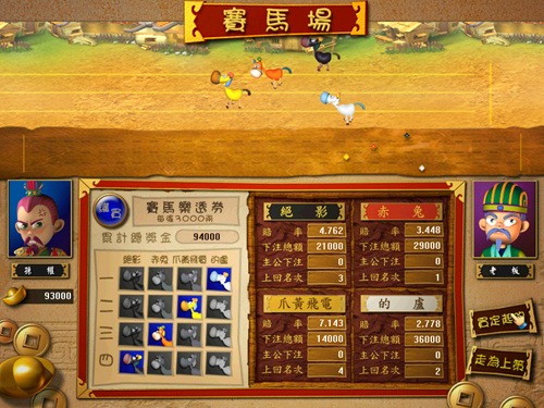 赛马场算是变化最大的赌场,四匹赛马可谓各具特色,如绝影一旦发飙时,快的连影子都看不见;赤兔只要发现红萝卜的踪迹,没有任何一匹马能追上它;爪黄飞电的特技是全身放电;的卢则是平日温驯善良,一想到跃檀溪的往事,马上飞身向前。玩家除了应多了解每匹马的特性外,研究它们目前的生理状况(高、低潮的变化),将有益于押中冠军马。本次赛马场中特别推出了“赛马乐透券”的设计,只要玩家能完全猜中一至四名的赛马,就可独得所有奖金,由于奖金可无限累计,所以一券在手希望无穷,说不定靠着一张赛马乐透券就能赢得最后胜利喔!喜欢刺激的玩家,千万别错过赛马场!