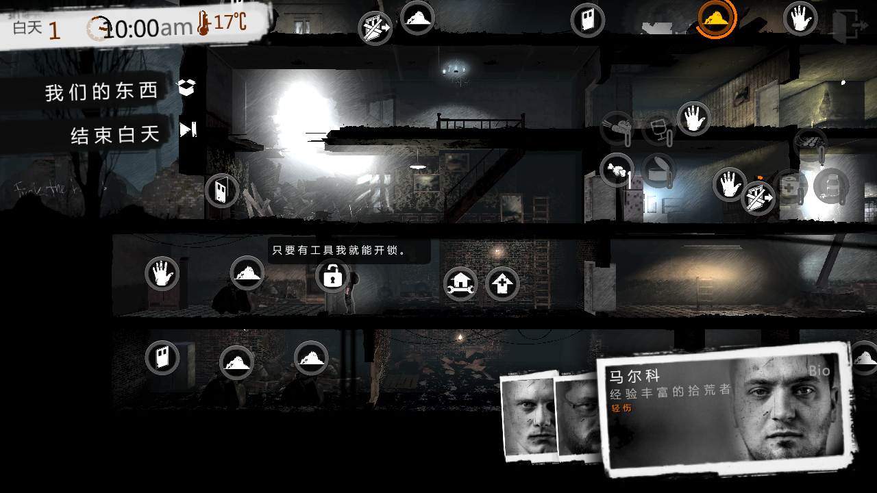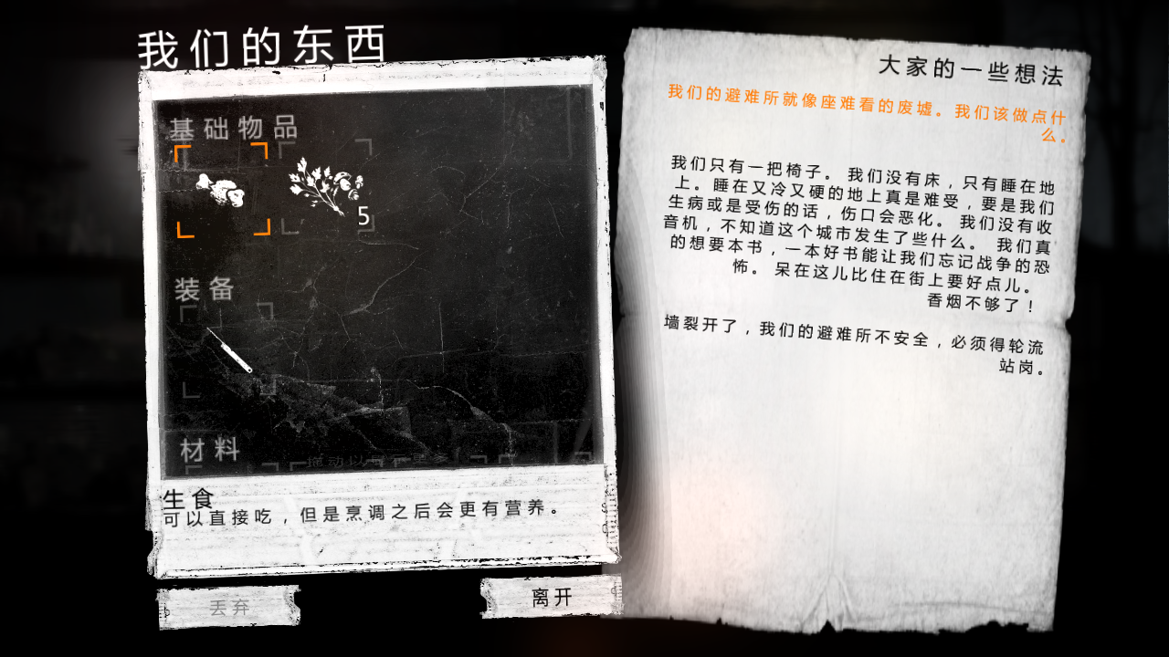 我想说,我做不到看着老人相依为命还去拿他们的食物和用品,但我也知道不拿我也活不下去,每每夜晚去刷东西碰到人都会陷入深深的自责,失手把老头打死,老奶奶在旁边痛哭的感觉真的太糟糕了,太糟糕!选择退出重来。看到男人不反抗只是求求我不要伤害他的妻子,求着留点东西跪在地上痛苦时,感觉自己特别不是个东西