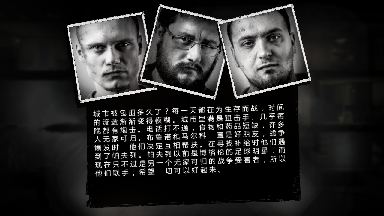 《我的战争》(这是我的战争)是一款由11 BIT出品的战争生存类游戏,这款游戏最大的魅力在于引人深思的剧情,游戏中的主线围绕着几个困在战争区中的难民展开,你需要做的是保证他们活下去,除了躲避从天而降的炮火,更多的危机来源于食物药物的短缺、寒冷的冬天以及对人性的考验,在生命终结前的最后一刻,是抢夺毫无抵抗的平民,选择为自己而活,还是坚守作为人的最后底线。