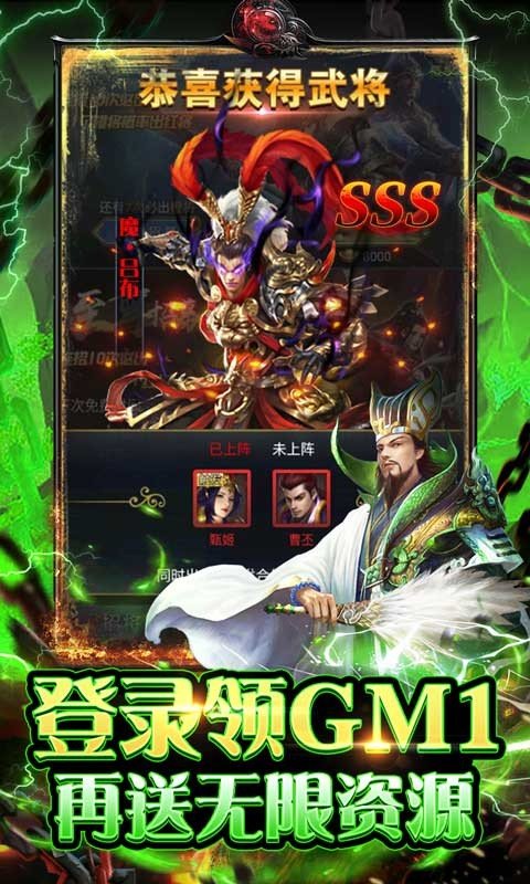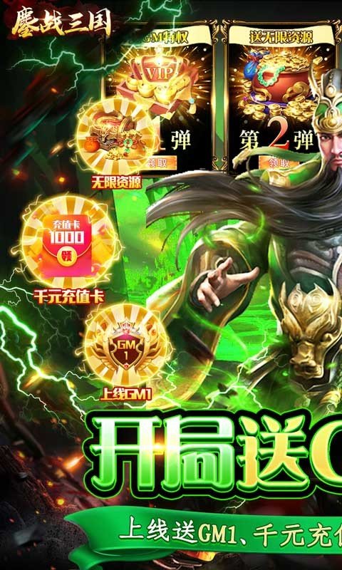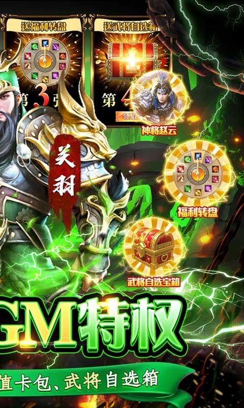 1、上线即送GM1特权,元宝*50000,福利抽奖券*50,红将自选宝箱*1,千元充值卡包,超进阶道具箱大礼包,