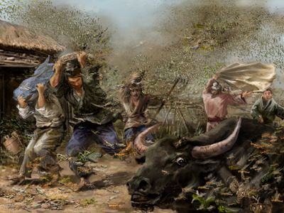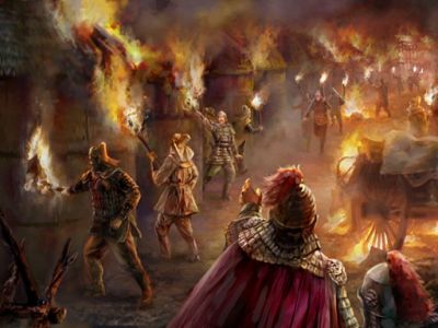 。城门战:攻方与守方在城们战斗,以火矢或破城墙等进行攻防