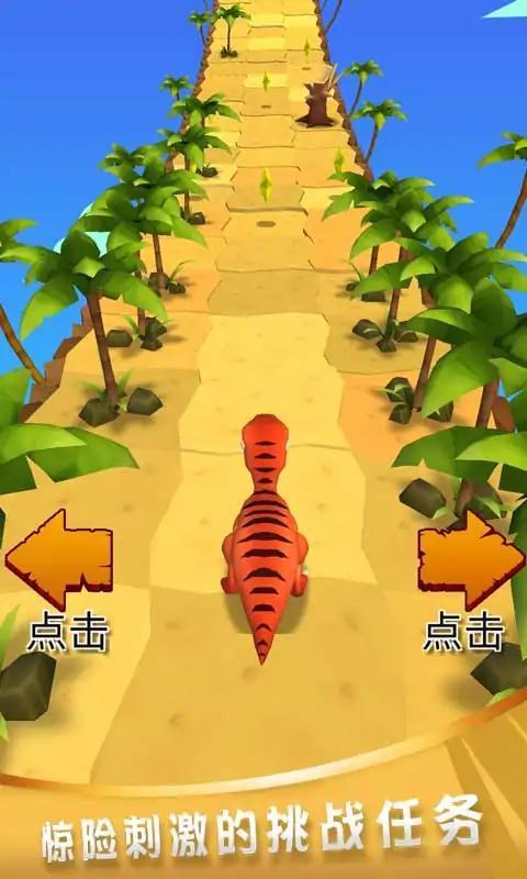 1、侏罗纪生存跑酷手指在屏幕两侧点击以改变恐龙移动方向,让恐龙躲开障碍物。