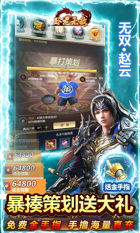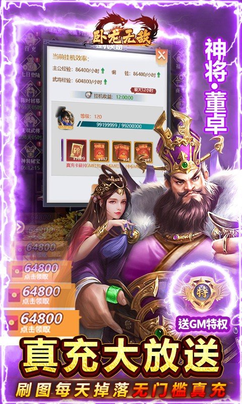 游戏简介:卧龙无敌超爽体验的策略放置卡牌手游全新来袭,开局即领策划金手指,激活5秒真男人模式,能拿多少648,全凭手速说了算,更是绝版称号!限时神权GM,千万元宝铜钱!VIP10!海量好礼奉上,VIP礼包领到手软,每天还能签到送现金卡,挂机也能领真充,免费激活充值活动。游戏汇集了众多历史名将,传承经典的武将缘分,丰富的武将阵容搭配,震撼的神兽和神驹,更有数十种合体大招组合机,酣畅战斗,一吕二赵三典韦,四关五马六张飞,黄许孙太两夏侯,三国名将尽入你瓮,以主公之名冠绝三国!