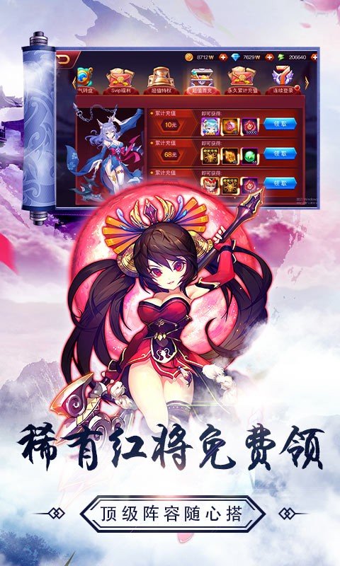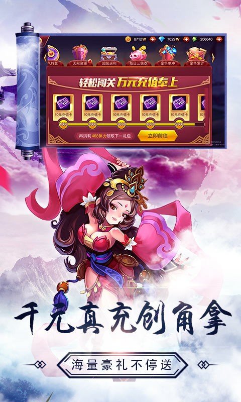 1.上线送满级VIP、千元真充卡、50w钻石、500w金币