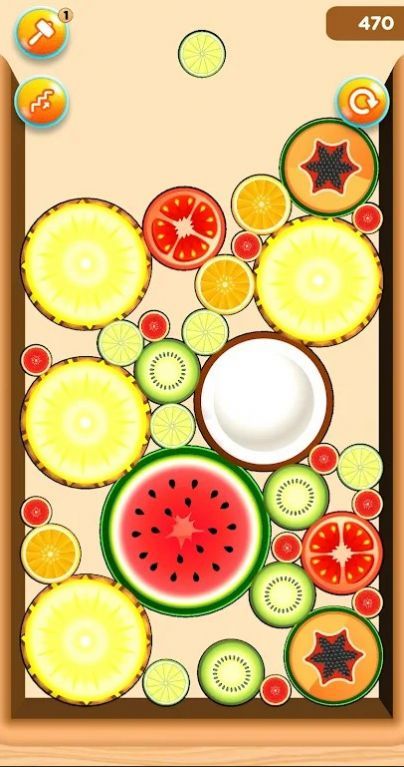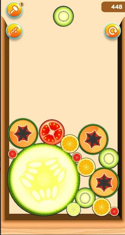 1、观察整个拼图局势,先合并较小的水果方块的设置;