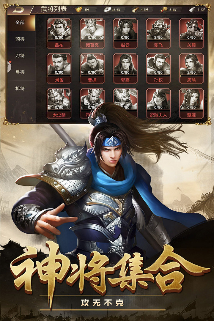 汇集三国史实数百武将,囊括大量谋臣英雄美人,战神吕布,卧龙诸葛亮,常山赵子龙,武圣关羽,魏王曹操,以及貂蝉,大小乔......名将云集,争霸三国。
