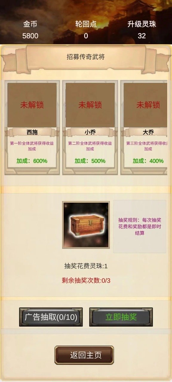 玩法简单易上手。玩家只需要招募角色,组建自己的武将队伍,然后就可以享受挂机的乐趣了。